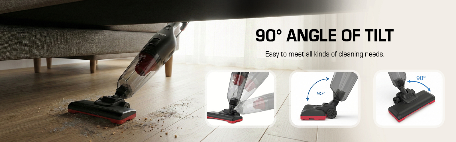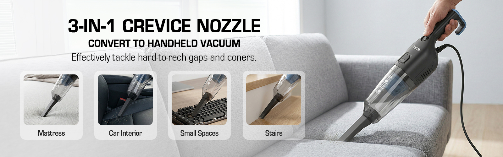 3-in-1 design: use as a stick vacuum, handheld vacuum, and crevice tool