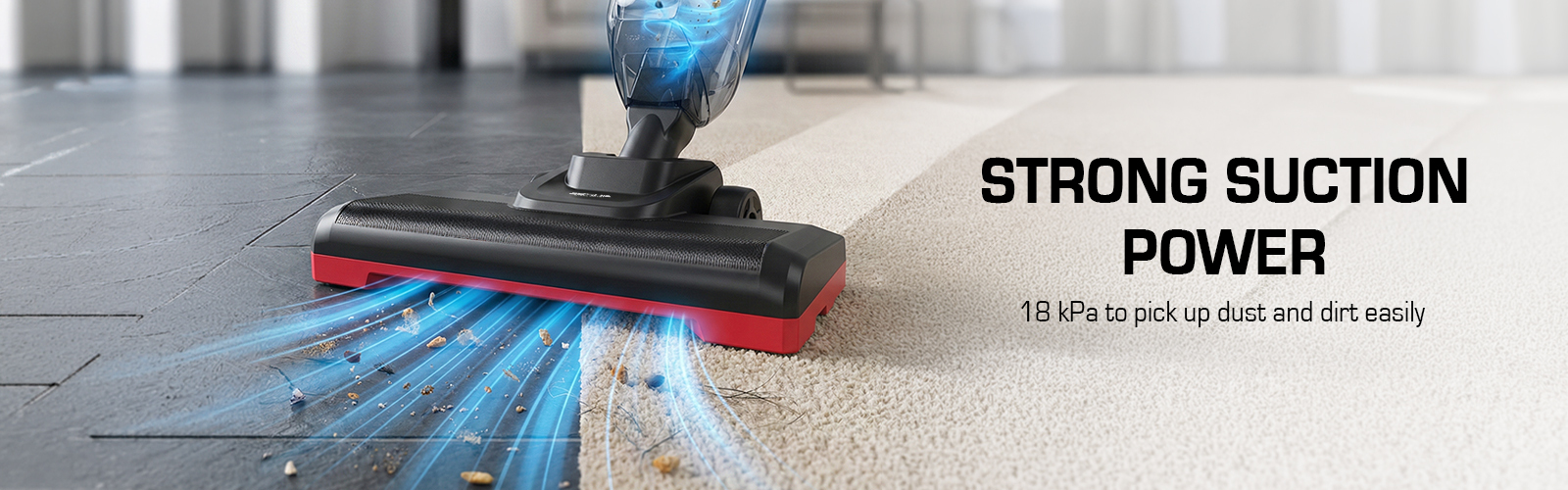 Strong suction power of 18 kPa to pick up dust and dirt easily