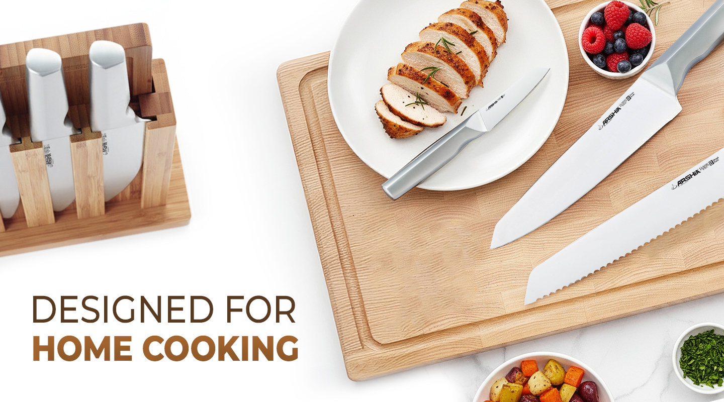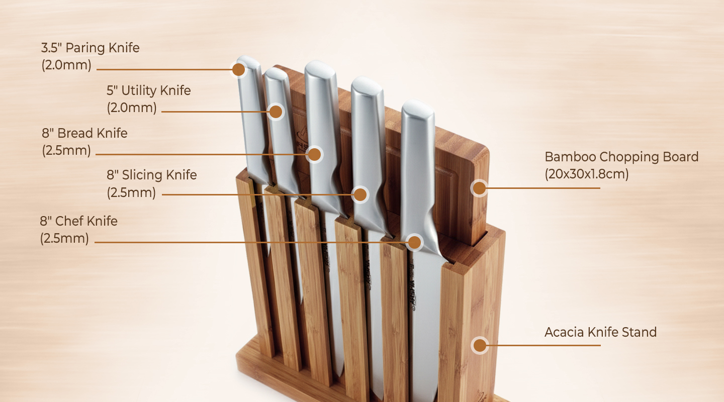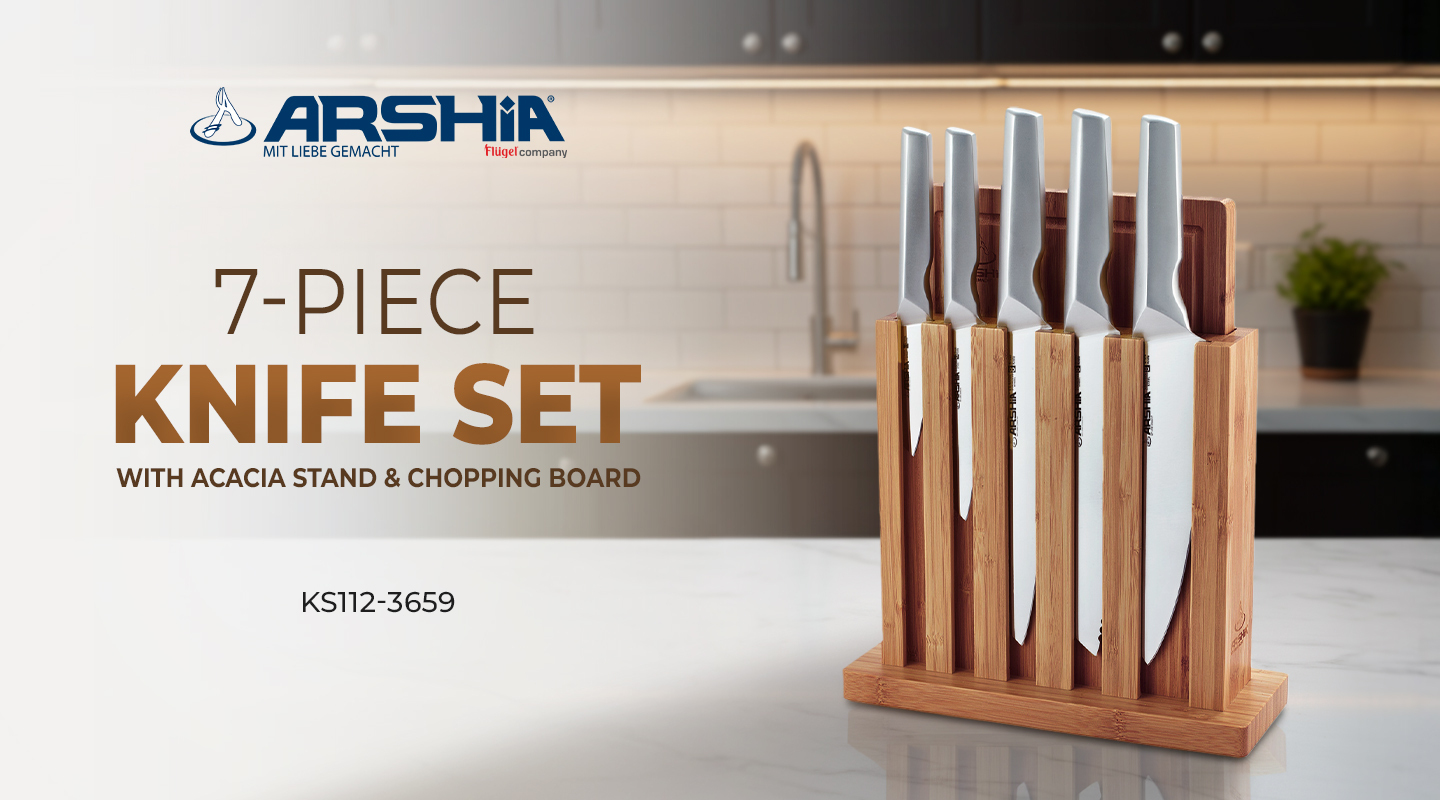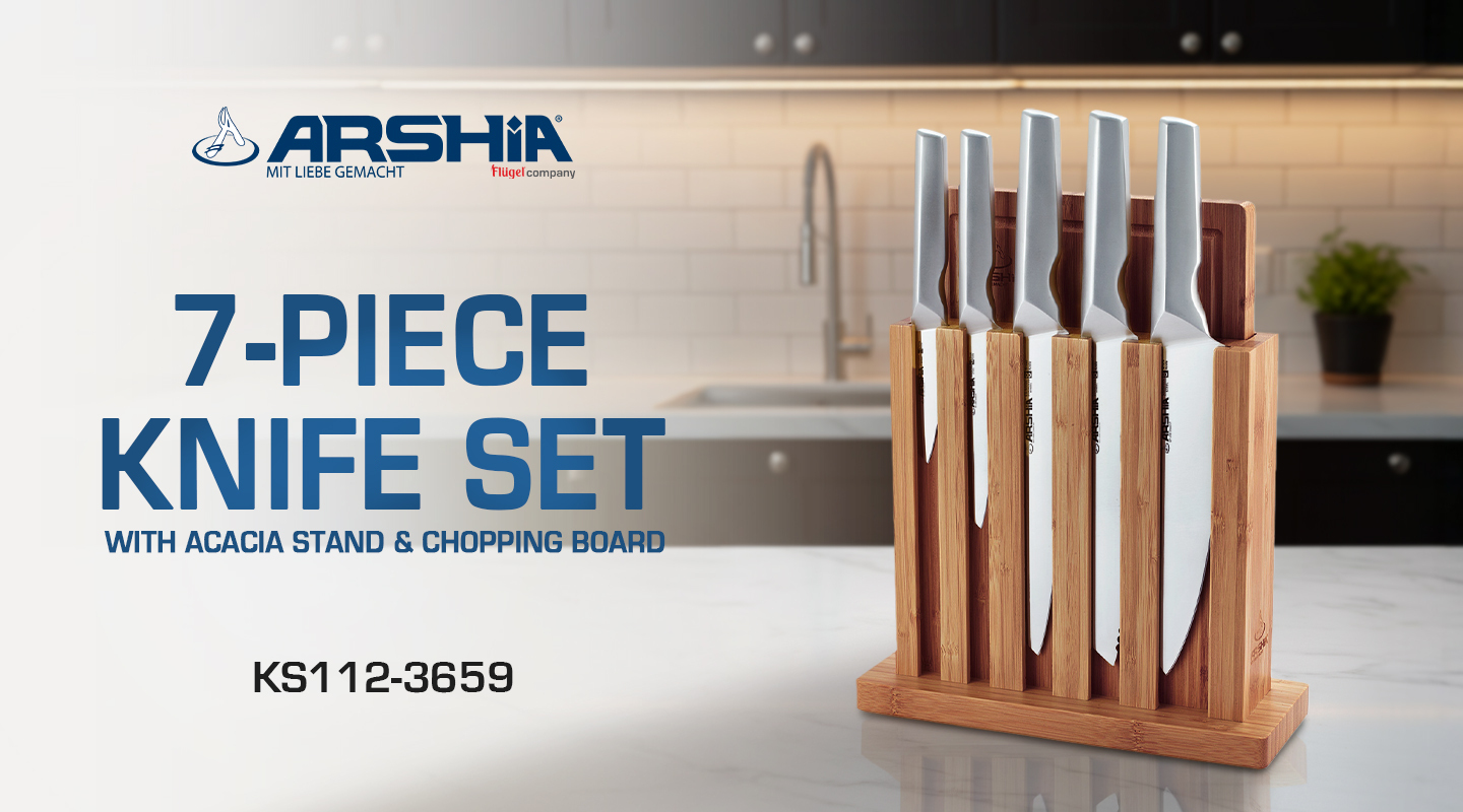 Elevate your kitchen with the Arshia 7-piece Knife Set with Acacia Stand, crafted for everyday use with high-quality knives, a bamboo chopping board, and a space-saving block. Perfect for all your food prep needs with a touch of style.