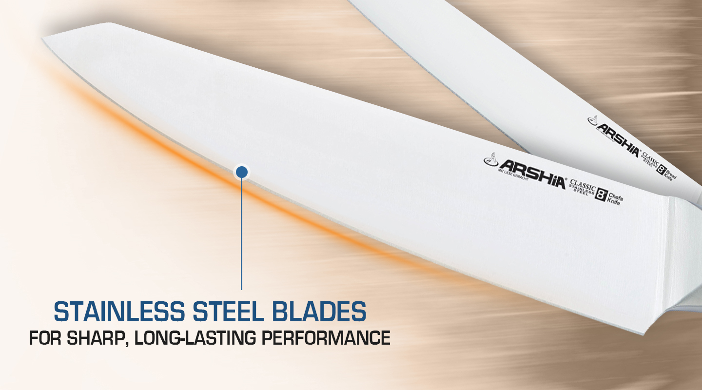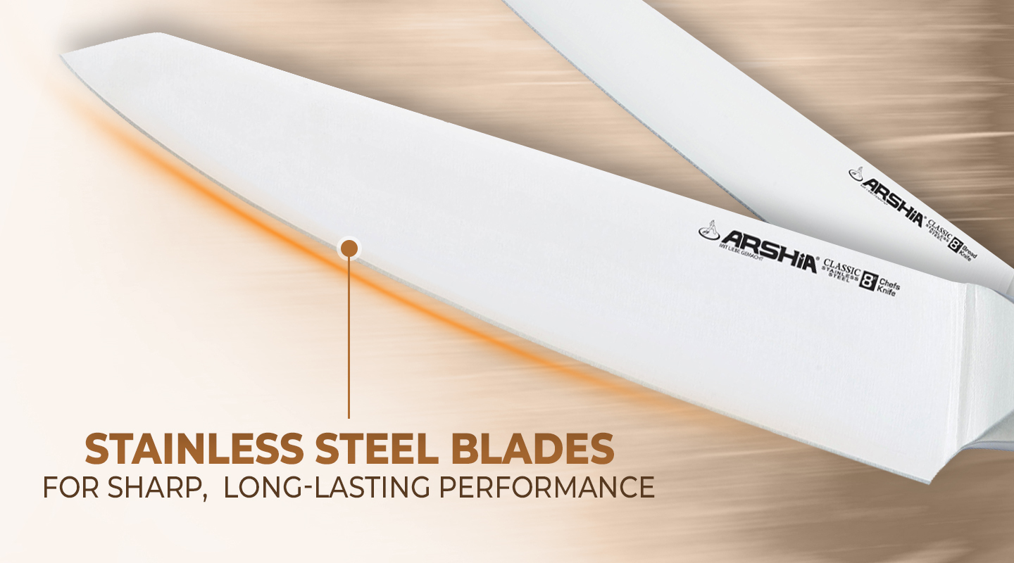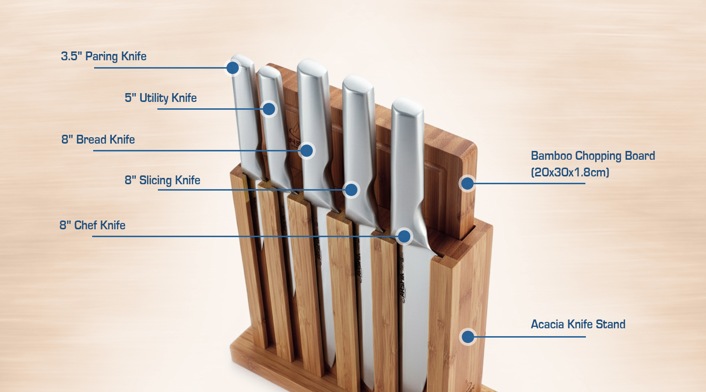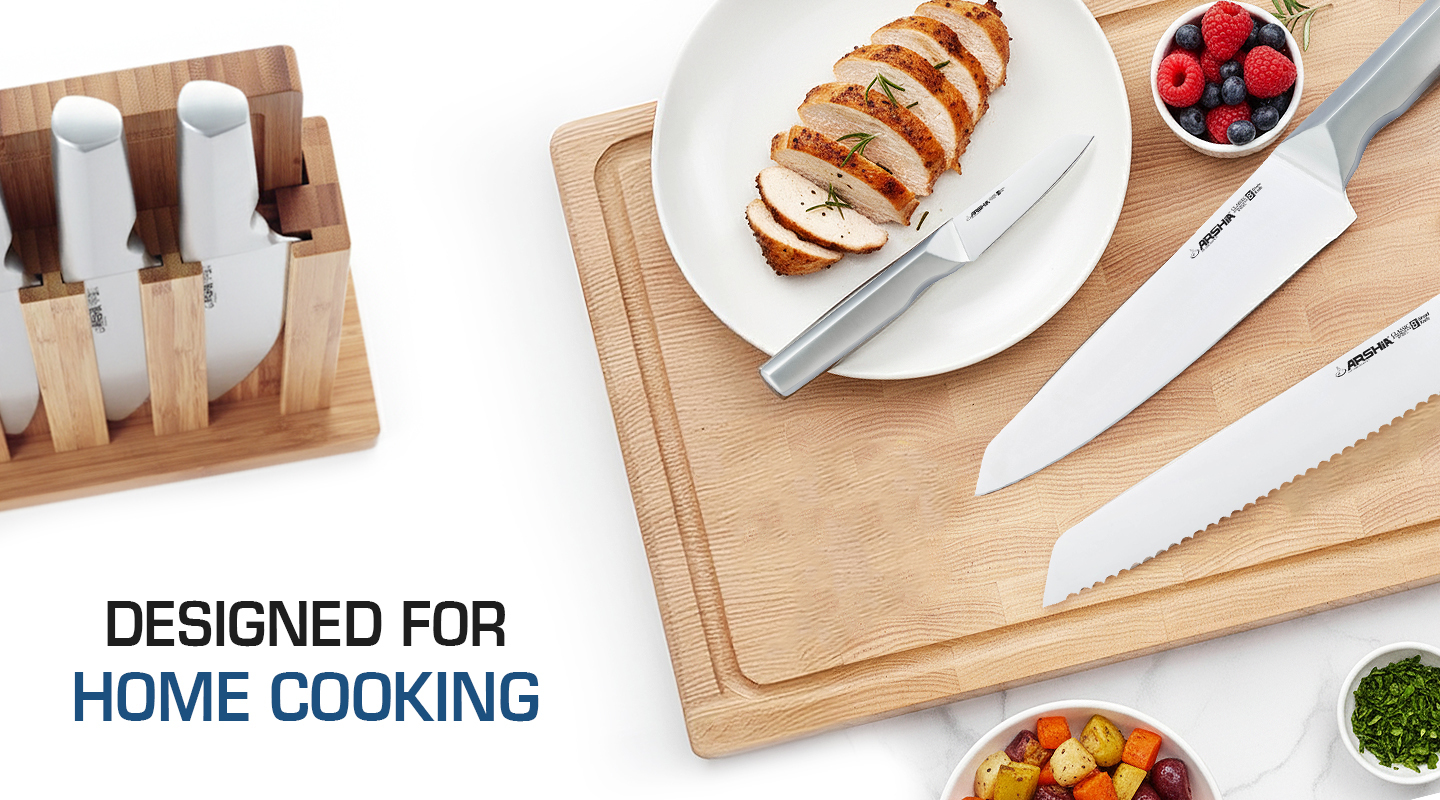 Elevate your kitchen with the Arshia 7-piece Knife Set with Acacia Stand, crafted for everyday use with high-quality knives, a bamboo chopping board, and a space-saving block. Perfect for all your food prep needs with a touch of style.