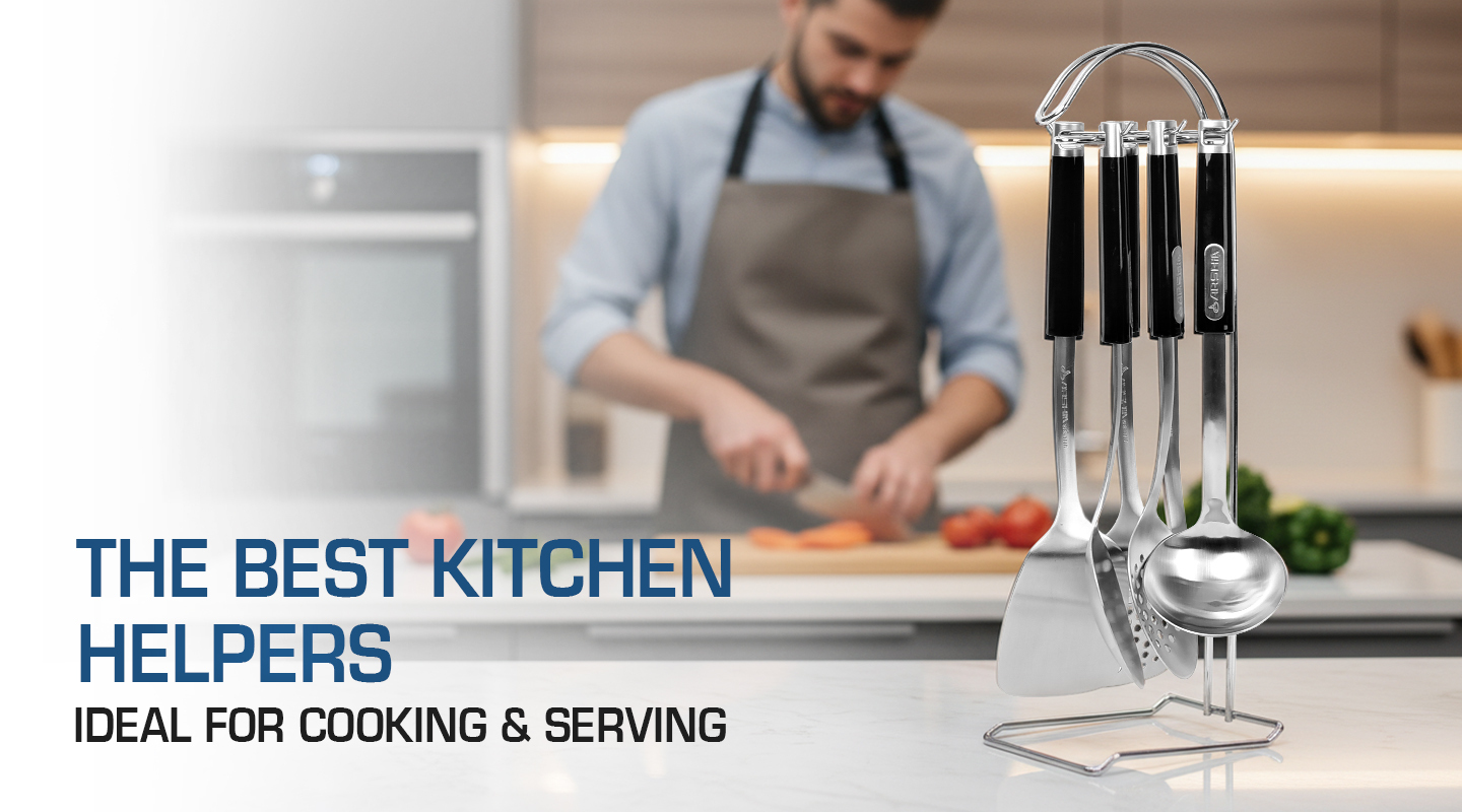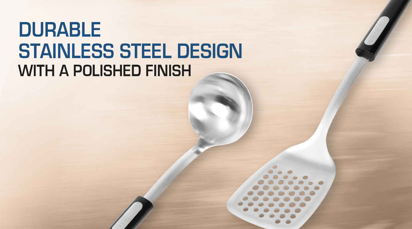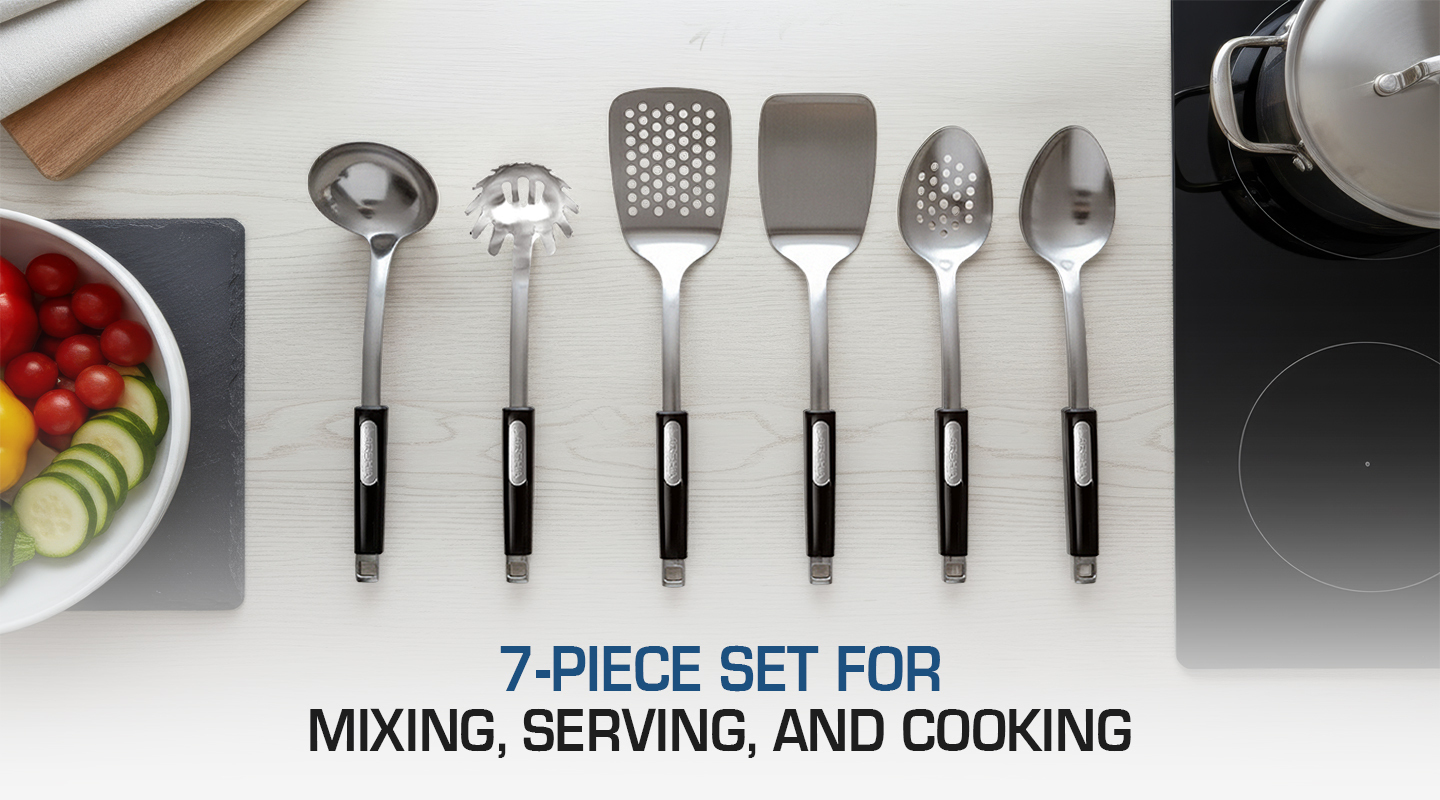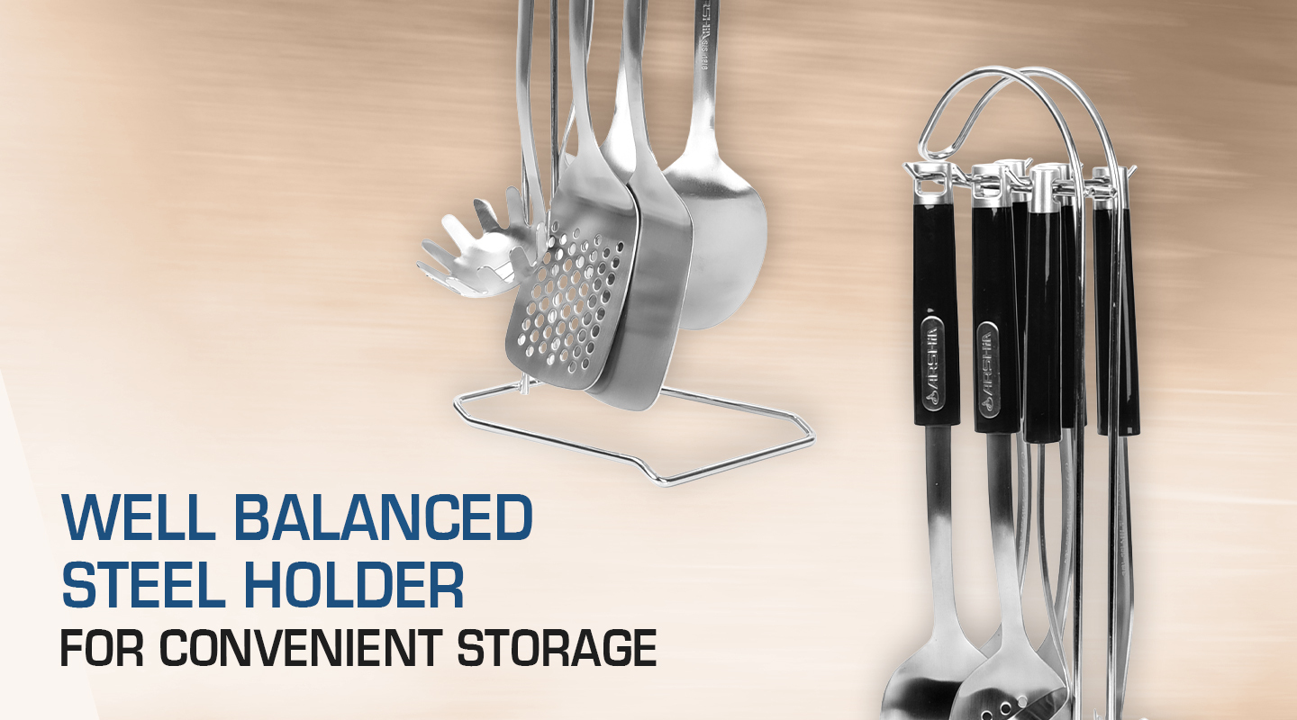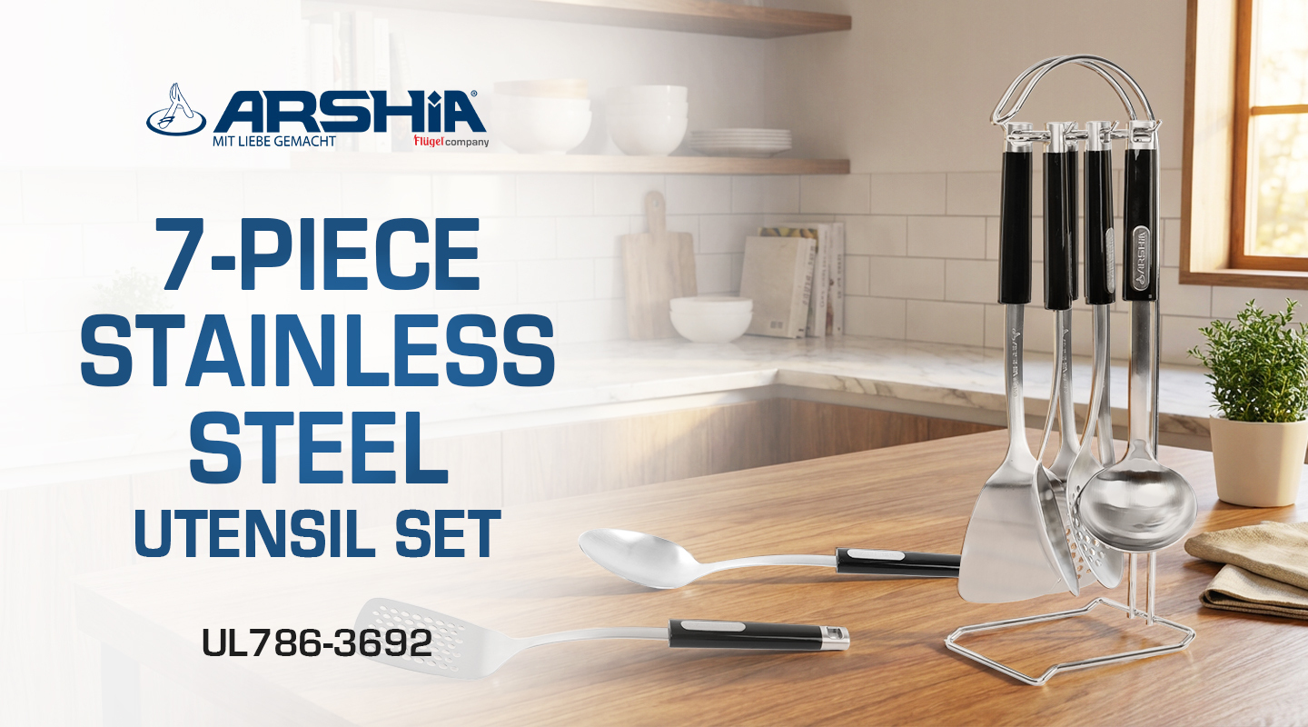 Keep your kitchen organized and ready for anything with Arshia 7-piece stainless steel utensil set. Each tool is crafted with a sleek chrome-plated finish and comfortable handles, giving you reliable performance for everyday cooking. The set also comes with a matching holder, so your utensils stay neatly arranged and within easy reach.