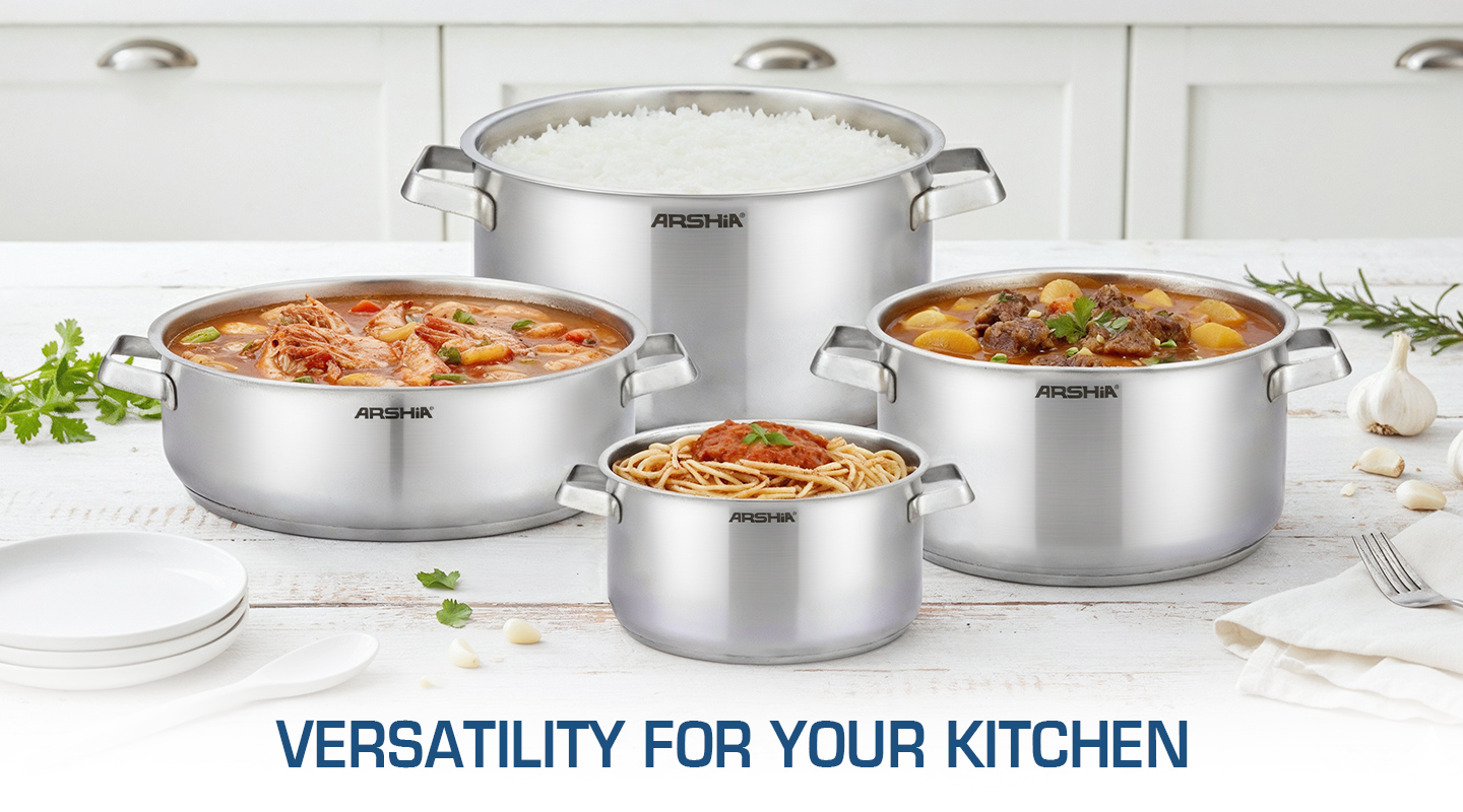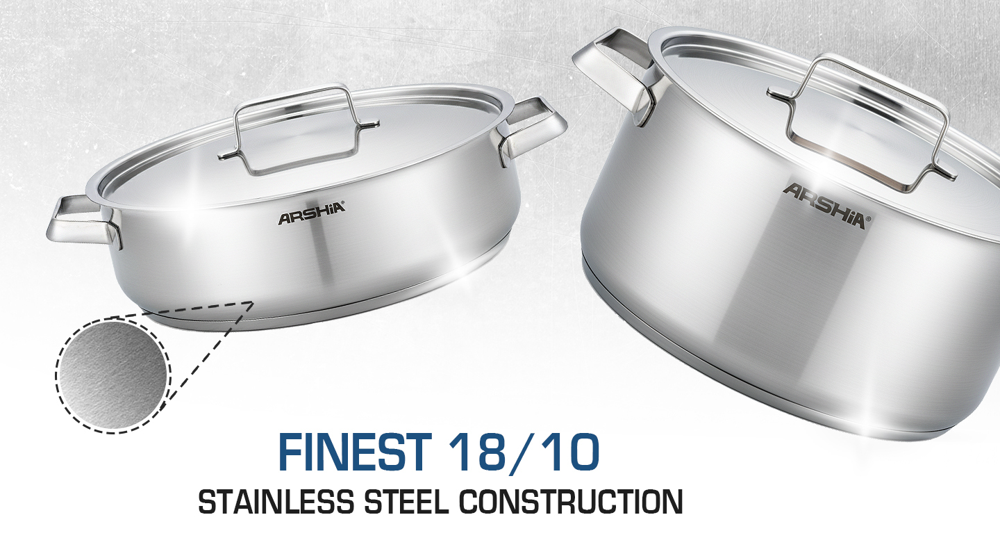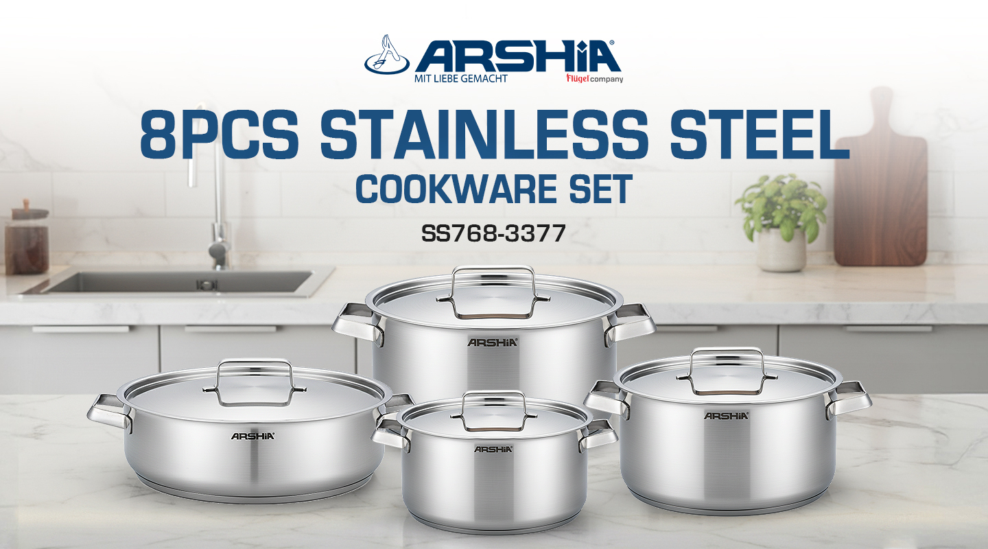 Transform your cooking experience with the Arshia 8pcs Stainless Steel Cookware Set. Made from Stainless Steel 18/0 for superior durability, this set delivers uniform heat distribution with its 3-layer compound bottom. Combining superior quality materials and an elegant design, it's perfect for all stovetops and every cooking need.