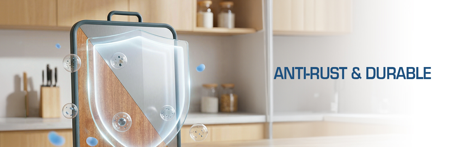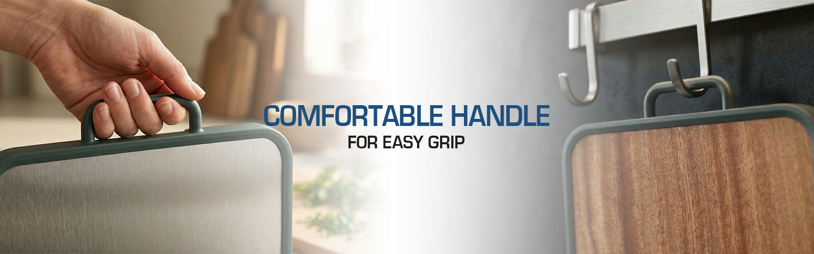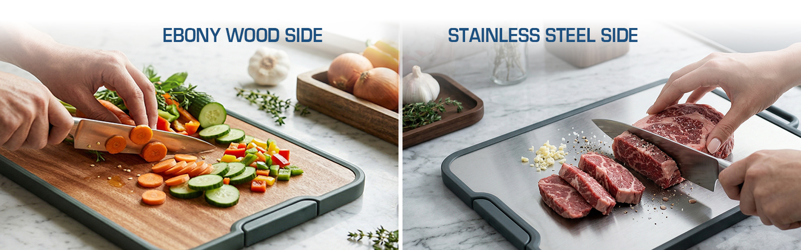 Make meal prep easier and more stylish with the Arshia Cutting Board. Designed with a sleek modern look, this board features two functional sides: a stainless steel side that's perfect for handling wet or messy ingredients, and a smooth ebony wood side that's gentle on knives and ideal for everyday chopping. It’s sturdy, easy to carry, and made to las!