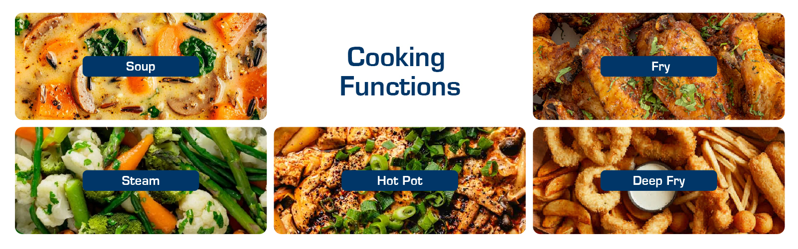 5 cooking functions: Soup, Steam, Hot Pot, Fry, and Deep Fry
