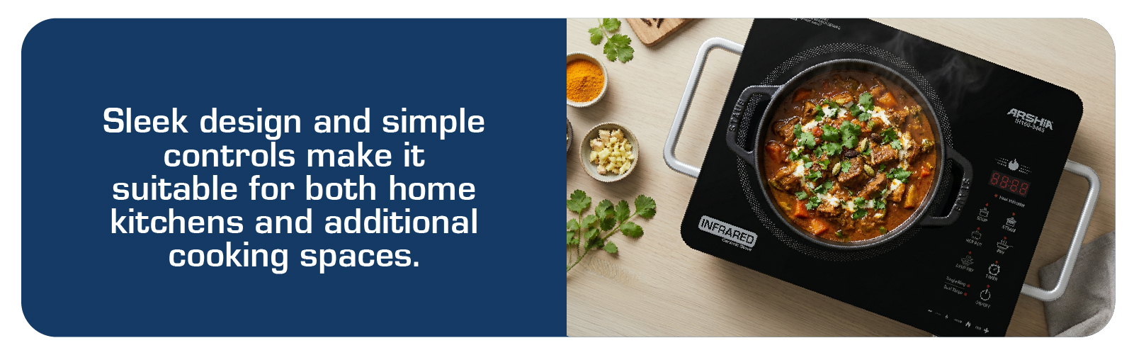 The Arshia Infrared Hob is a compact and efficient cooking solution designed for everyday use. Featuring infrared heating technology and a high-strength ceramic glass surface, it delivers fast and consistent heat while remaining compatible with a wide range of cookware. Its sleek design and simple controls make it suitable for both home kitchens and additional cooking spaces.