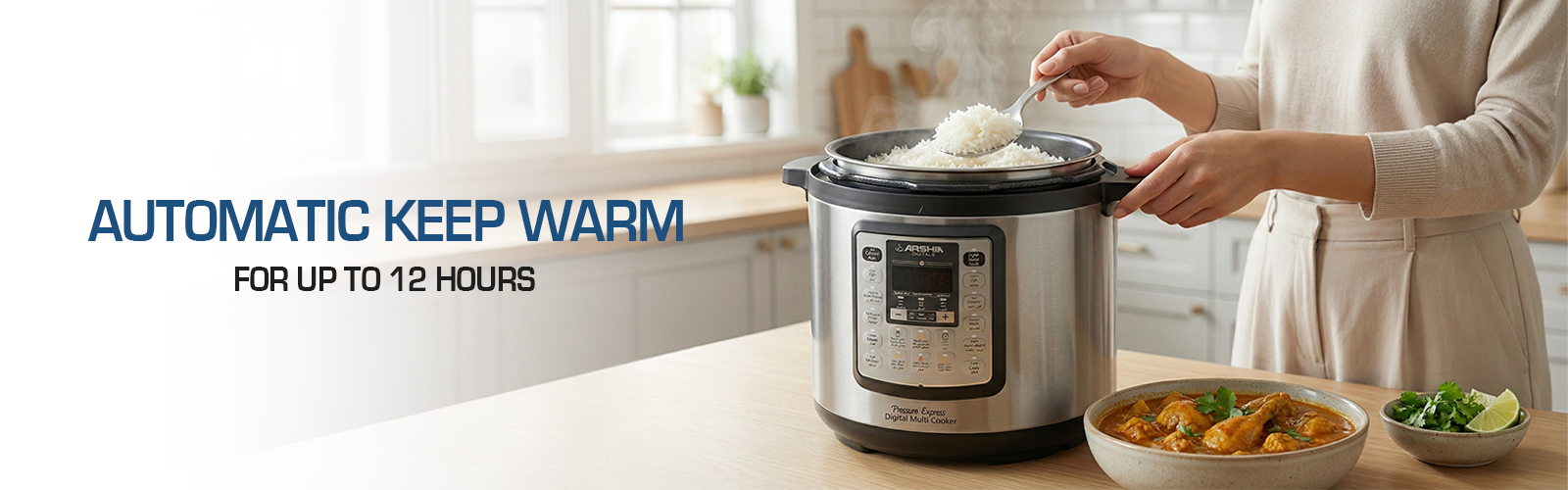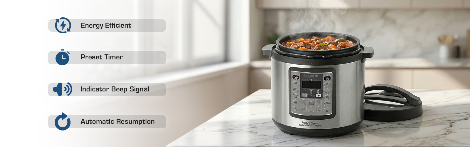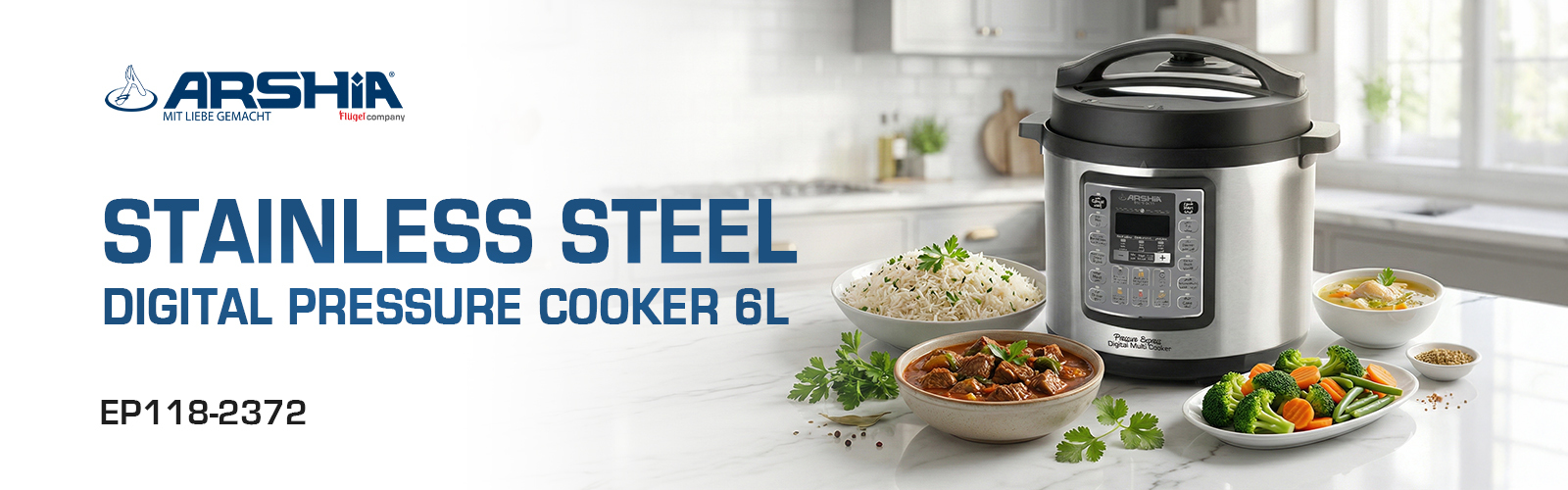 Introducing the Arshia Digital Pressure Cooker, a versatile kitchen appliance designed for fast, precise cooking with lock-in freshness. Ideal for a variety of dishes from rice to soups and cakes, this cooker simplifies meal preparation with its intuitive digital control panel and advanced safety features.