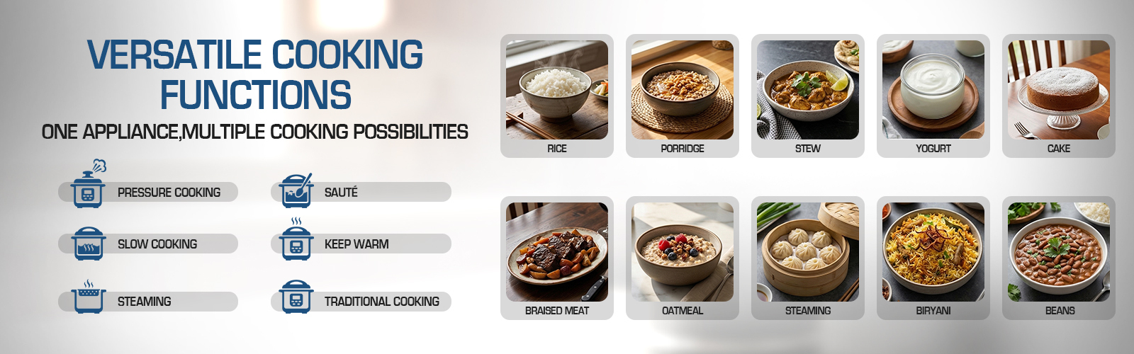 - Automatic pressure cooking with resume function after power outage.