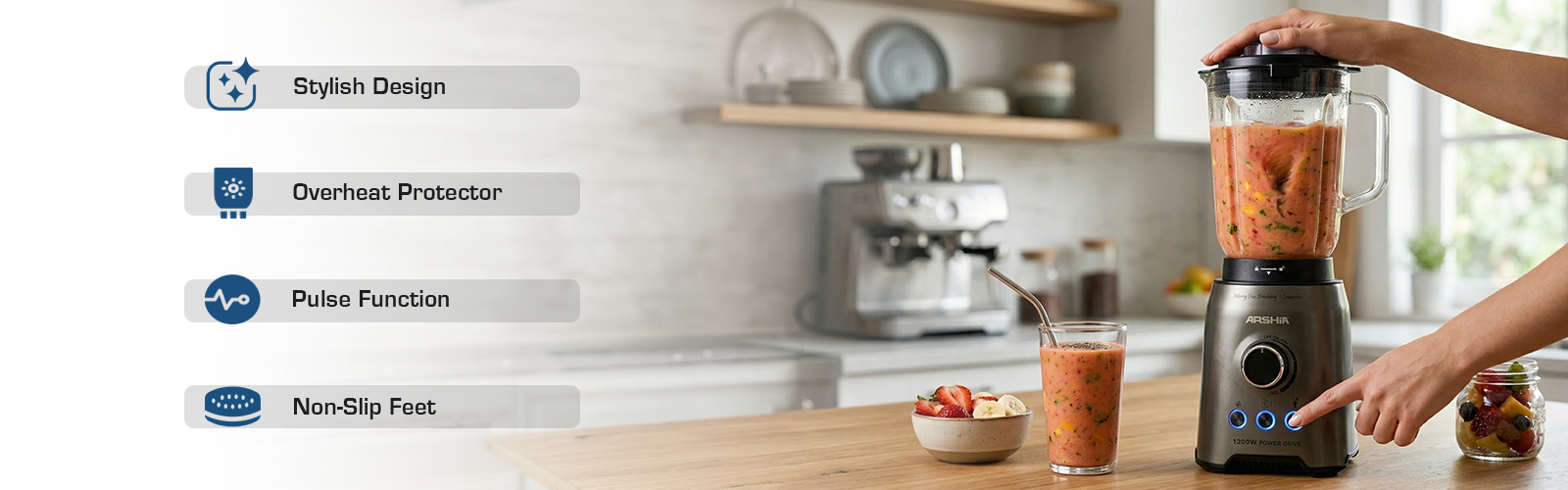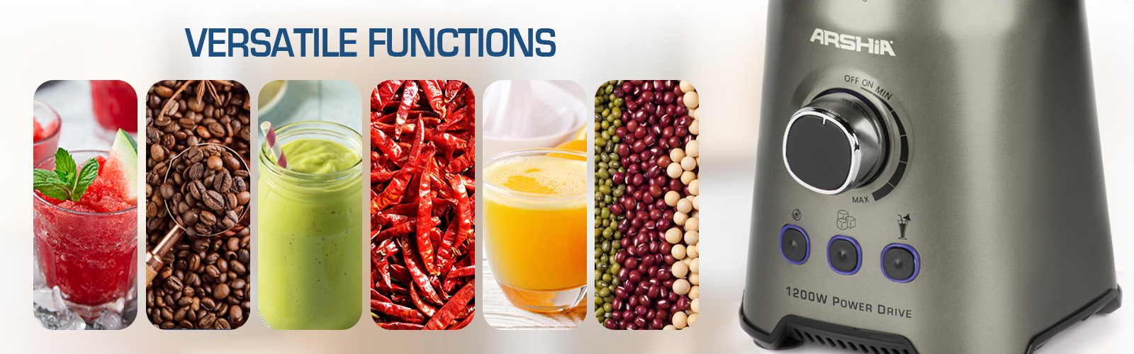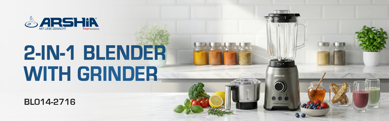 Introducing the Arshia 2 in 1 Blender with Grinder, a powerful kitchen essential designed to handle all your blending and grinding tasks with ease. Featuring a robust 1200W full copper motor, this appliance ensures efficient performance and long-lasting durability. Whether you're chopping, mixing, blending, liquefying, or crushing ice, this blender is up to the task.