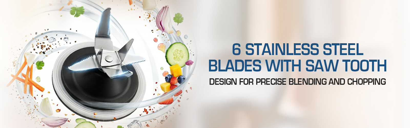 - 6 stainless steel blades with saw tooth design for precise blending and chopping.